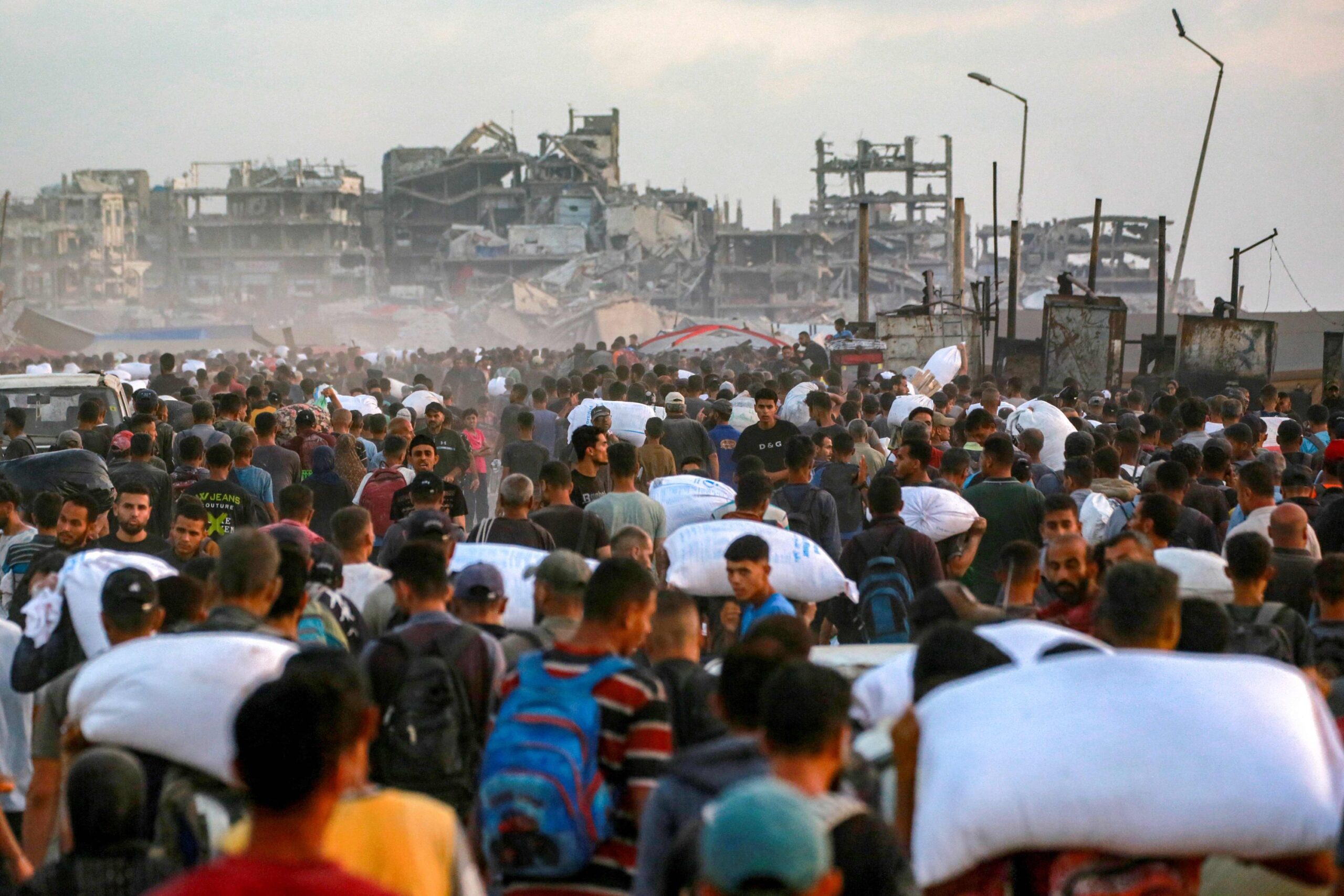 شبان يتمكنون من الحصول على أكياس الطحين بعد دخول شاحنات محملة بالمساعدات إلى شمال قطاع غزة، في 27 تموز/ يوليو 2025. (المصدر: وكالة فرانس برس)