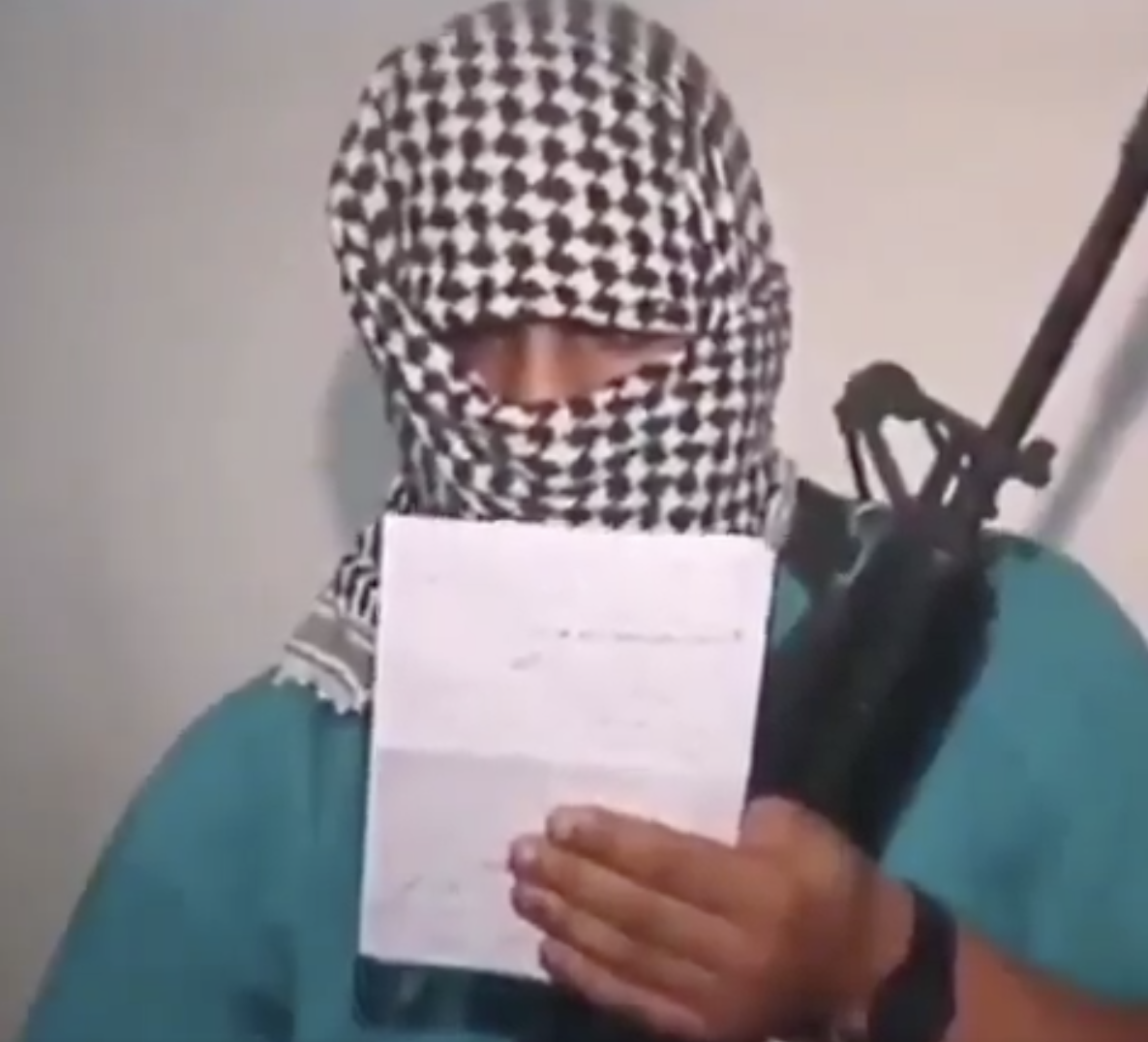 في اليوم التالي، ظهر رجل يتخفى خلف لثام بالكوفية الفلسطينية ويرتدي قميصاً أخضر، ويمسك بورقة يقرأ منها بيان العملية: