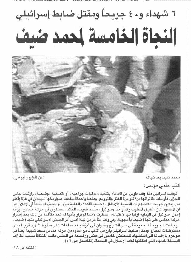 كان ذلك محمد بن دياب بن إبراهيم المصري، المعروف "بالضيف"، قائد كتائب القسّام.