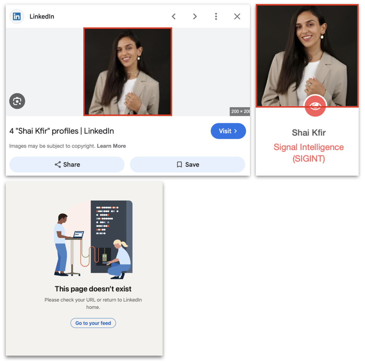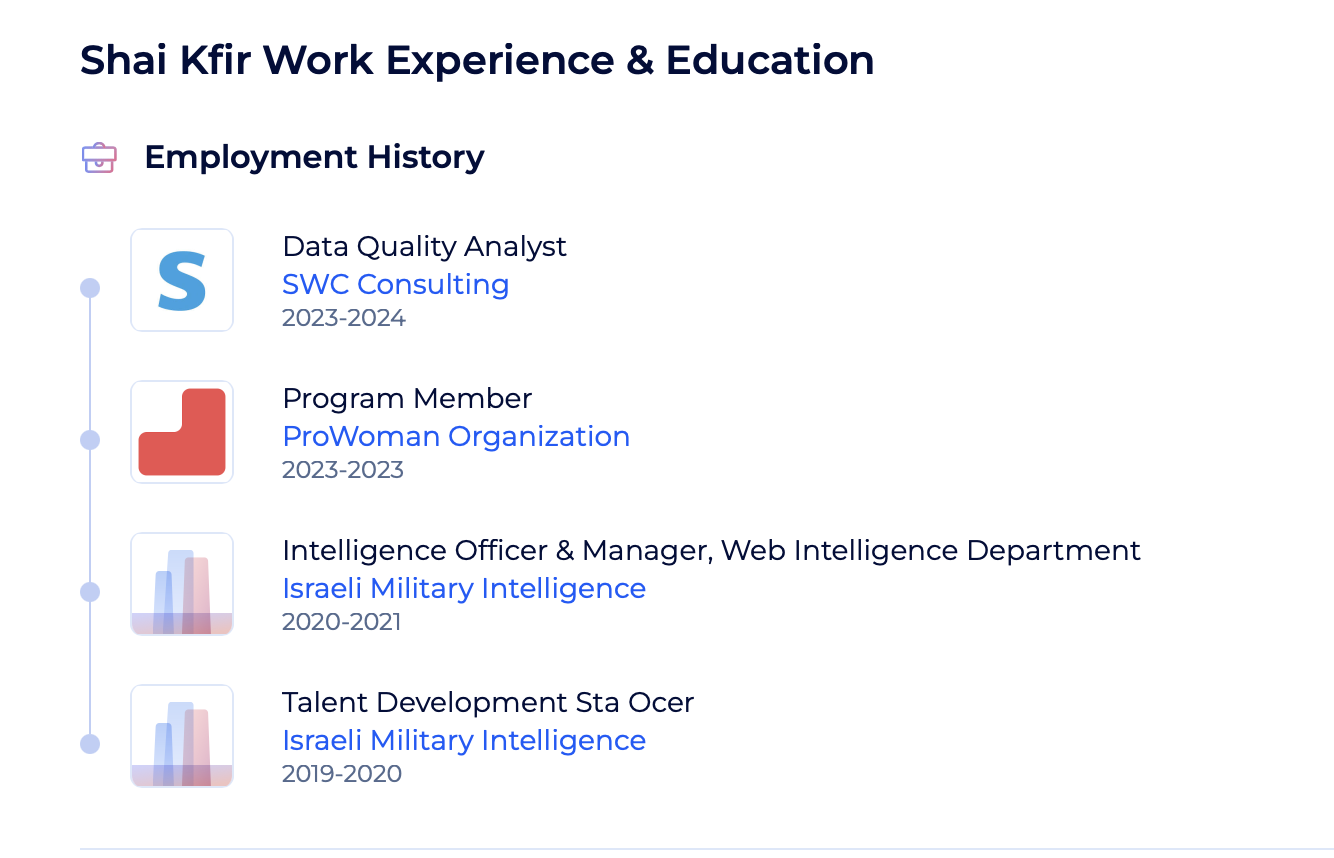 وظهر من الحساب المذكور أن "Shai Kfir" عملت في شركة (SWC CONSULTING) و (PROWOMAN) وهو ما يتوافق مع ما ذكرناه مسبقا، واكتشفنا من خلال الحساب أنها عملت أيضاً ضابط استخبارات ومدير قسم استخبارات الويب في الاستخبارات العسكرية الإسرائيلية ما بين 2019 - 2021.