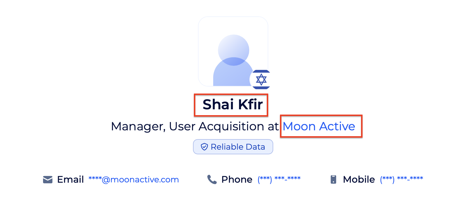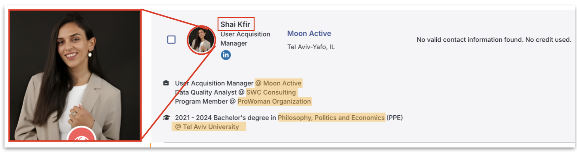 وخلال البحث في مسارها المهني، وصلنا إلى موقع Zoom Info حيث وجدنا حساباً باسم "Shai Kfir" وتأكدت ملكيتها للحساب، إذ تطابقت معلومات عملها في شركة (Active moon) ما يشير إليه حسابها، مع ما رصدناه مسبقاً عن عملها في هذه الشركة.