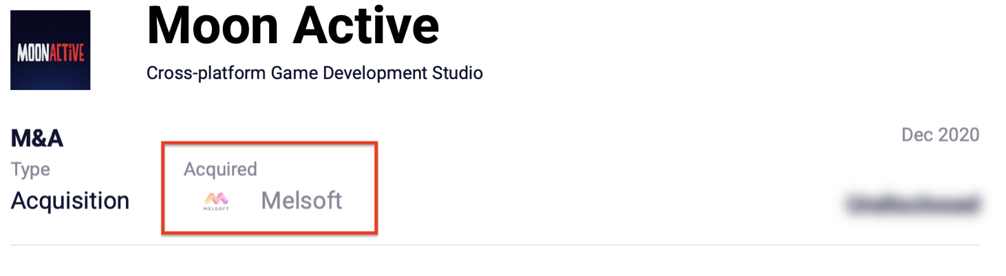 بمزيد من البحث ظهر أن شركة (Moon Active) استحوذت على شركة (Melosft) الإسرائيلية التي تنشط في مجال الألعاب الإلكترونية أيضاً.