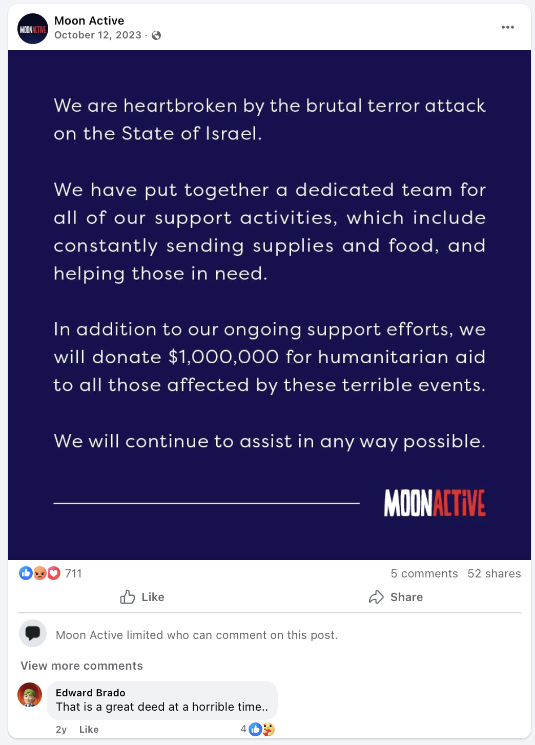 وبالوصول إلى حساب الشركة على منصة "فيسبوك" وجدنا أن آخر منشوراتها يعود الى 12 تشرين الأول/ أكتوبر 2023، أعلنت الشركة فيه عن تخصيصها لفريق يساعد في كل أنشطة دعم الأسر الإسرائيلية "المتضررة" من عمليات المقاومة الفلسطينية "إسرائيل". وأعلنت أنها ستتبرع بمبلغ مليون دولار للمساعدات الإنسانية للمتأثرين بذلك الهجوم، وختمت بيانها بأنها ستستمر في المساعدة بأي طريقة ممكنة.
