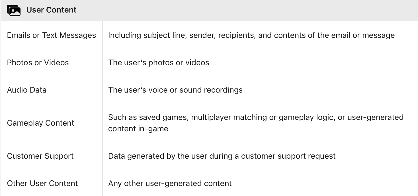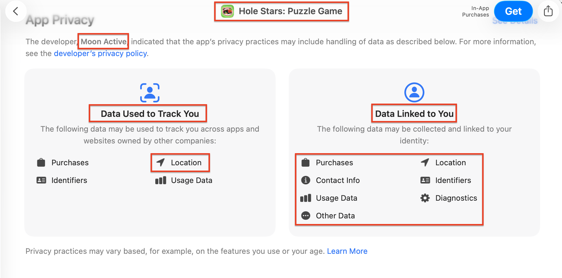 على سبيل المثال في لعبة (Hole Starts: Puzzle Game) التي وصل عدد مستخدميها إلى مليون ونصف مستخدم بعدد تحميلات يومية يتجاوز الـ 6 آلاف مستخدم. تطلب هذه اللعبة أذونات الوصول إلى الموقع الفعلي للمستخدم وتظهر داخل قسم الخصوصية أنها لأغراض التتبع وربط البيانات بالمستخدم، وتطلب أذونات بيانات الاتصال الخاصة بالمستخدم وغيرها من الأذونات.