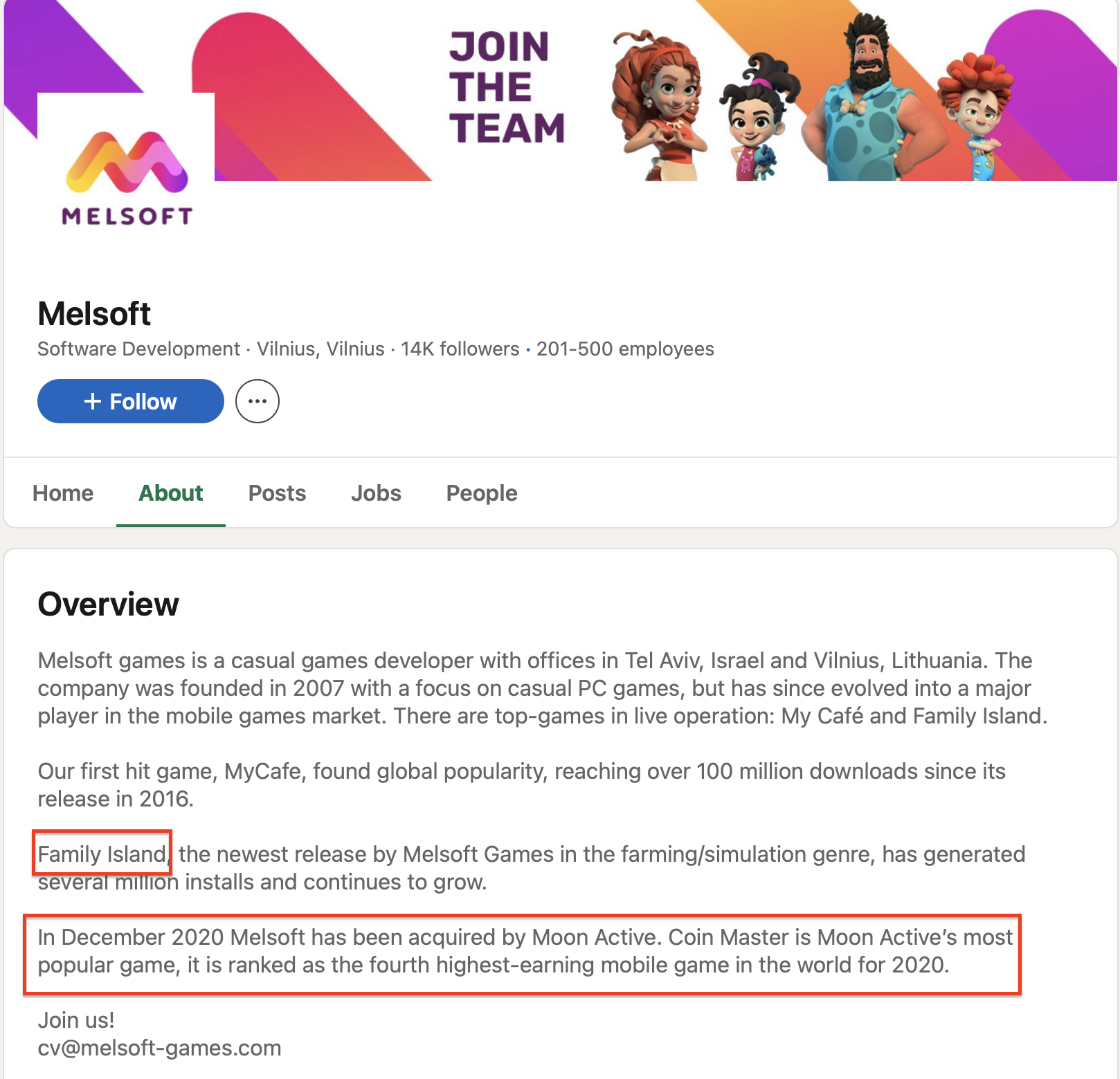 تأكد ذلك بالوصول إلى حساب (Melsoft) على "لينكد إن"، وقد أعلنت الشركة أن (Moon Active) استحوذت عليها في 2020 وأن آخر الألعاب التي أنتجتها الشركة (Family Island).