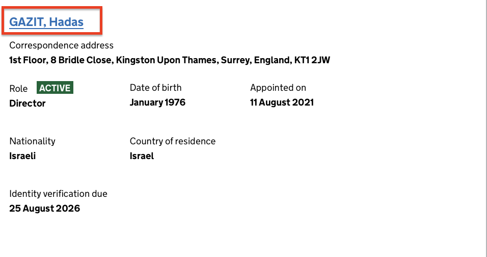 بالبحث عن هذه الشركة، تبين أنها أنشئت في بريطانيا عام 2011، وظهر أن اسمها تغير أكثر من مرة، وتديرها هداس غازيت (Gazit Hadas)، المديرة المالية لشركة (Moon Active).