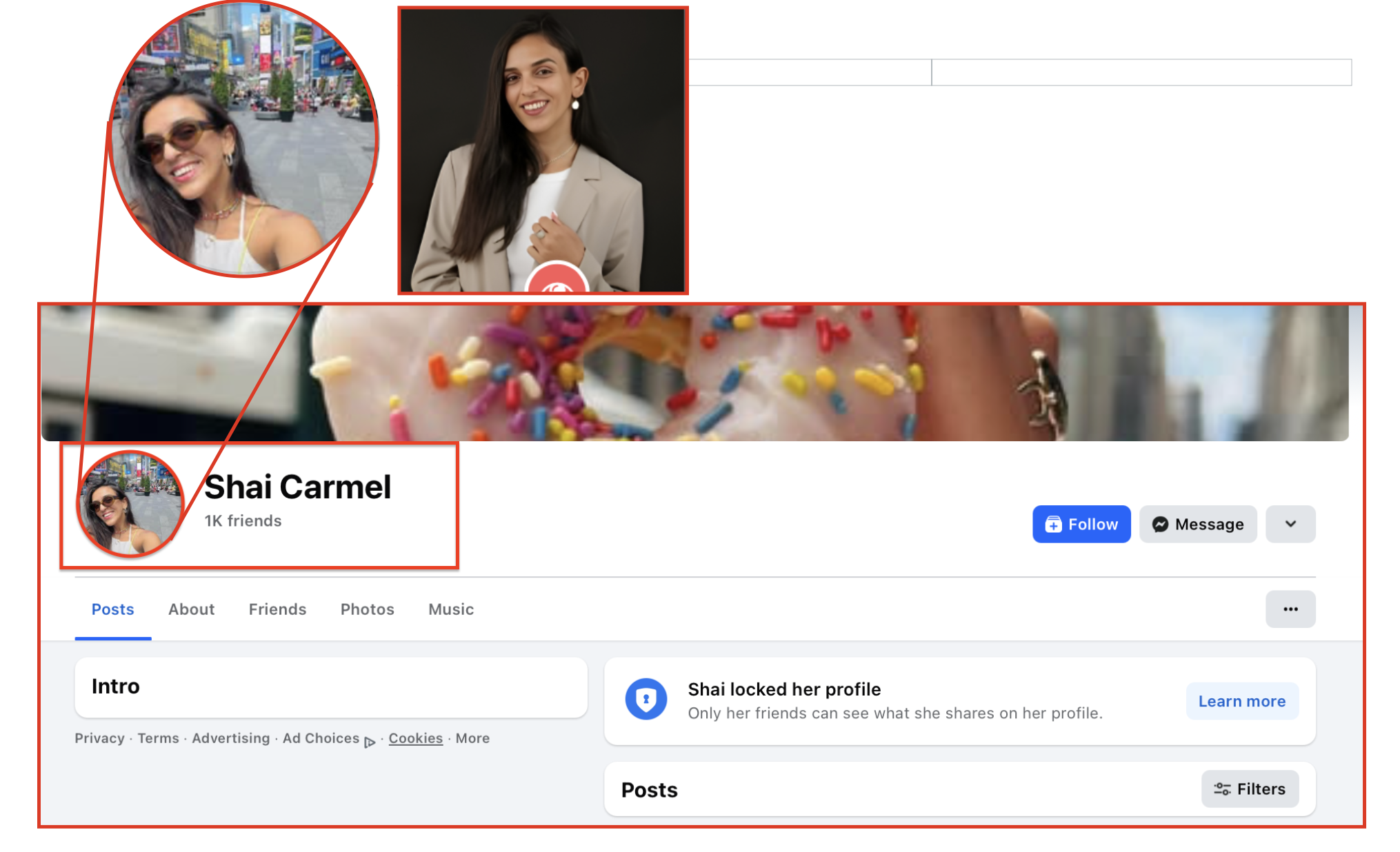 وبمزيد من البحث ظهر حساب الفيسبوك الخاص بها، وتأكدت ملكيتها الحساب بعد مقارنة صورة الحساب بالصورة التي لدينا، وظهر أن اسمها "Shai Carmel".