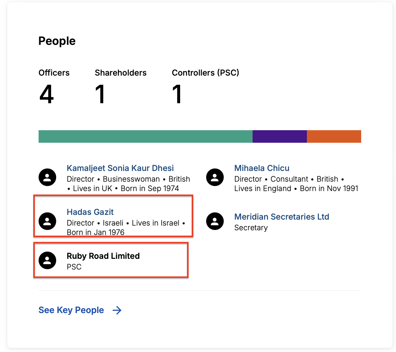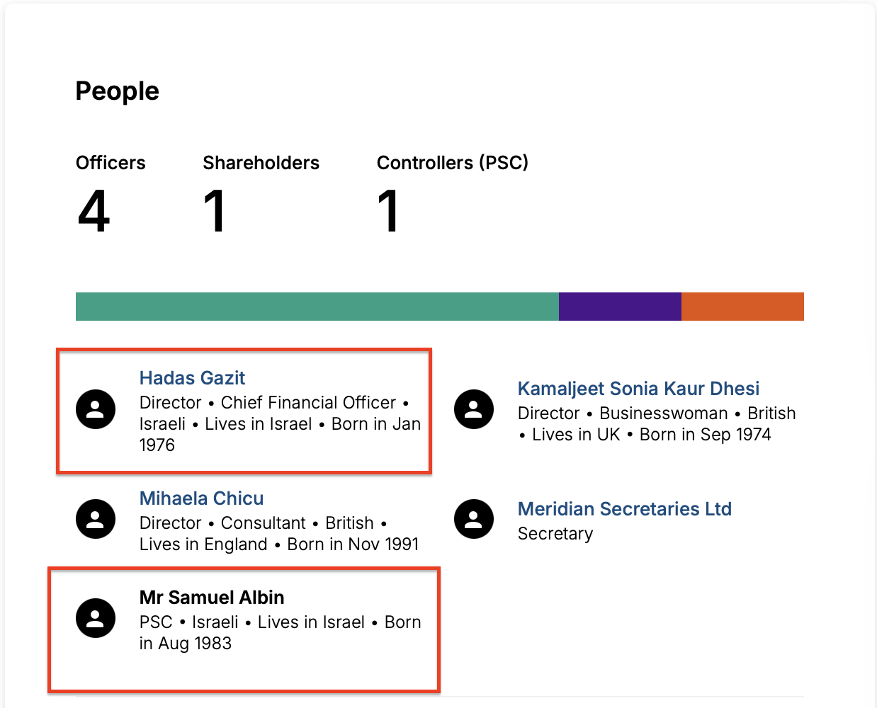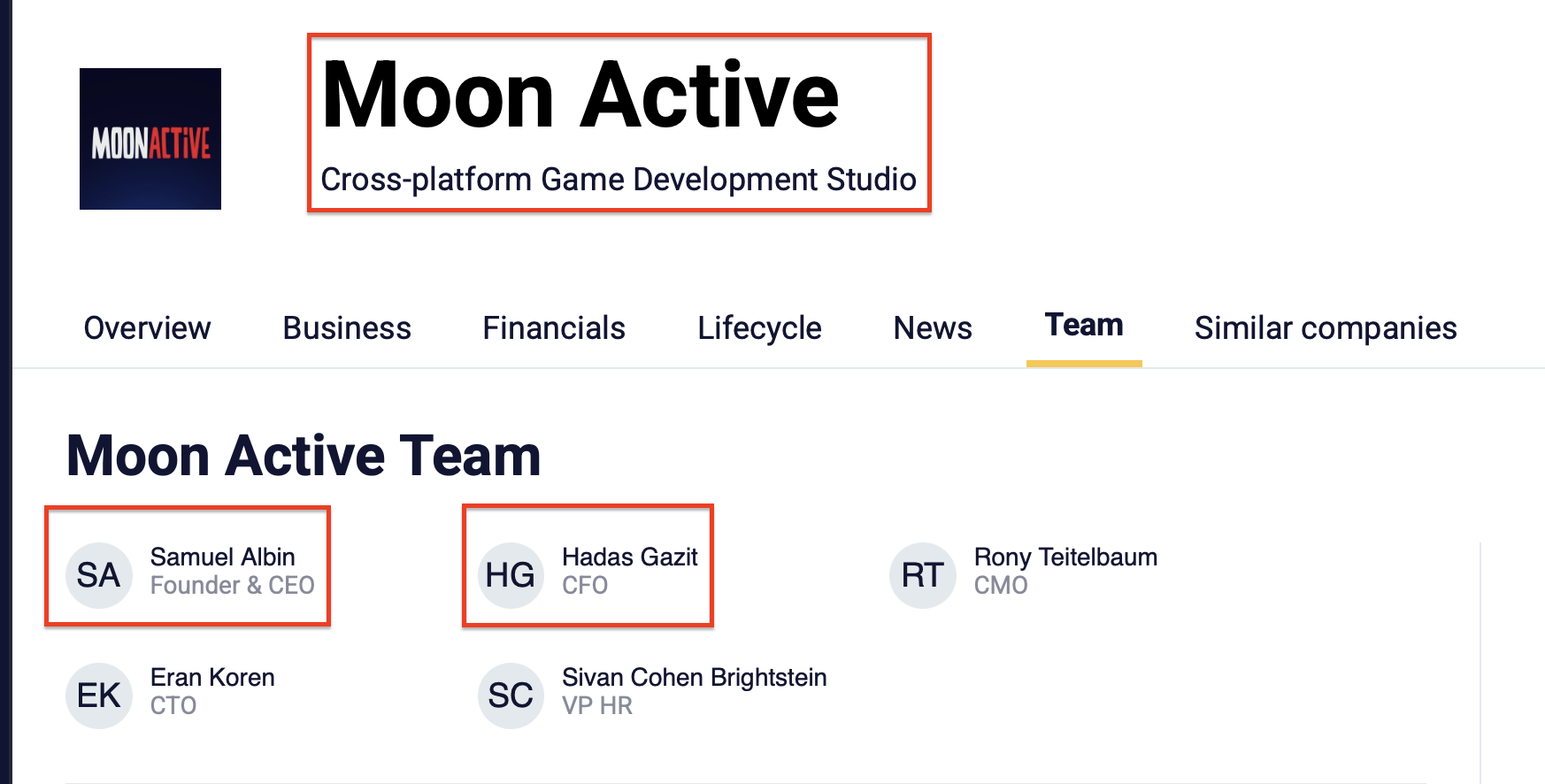 كما أظهر البحث اشتراك هداس غازيت (Gazit Hadas) المديرة المالية في (Moon Active) وصامويل ألبين (Samuel Albin)، المؤسس والرئيس التنفيذي لـ (Moon Active) في إدارة (Ruby Road Limited).